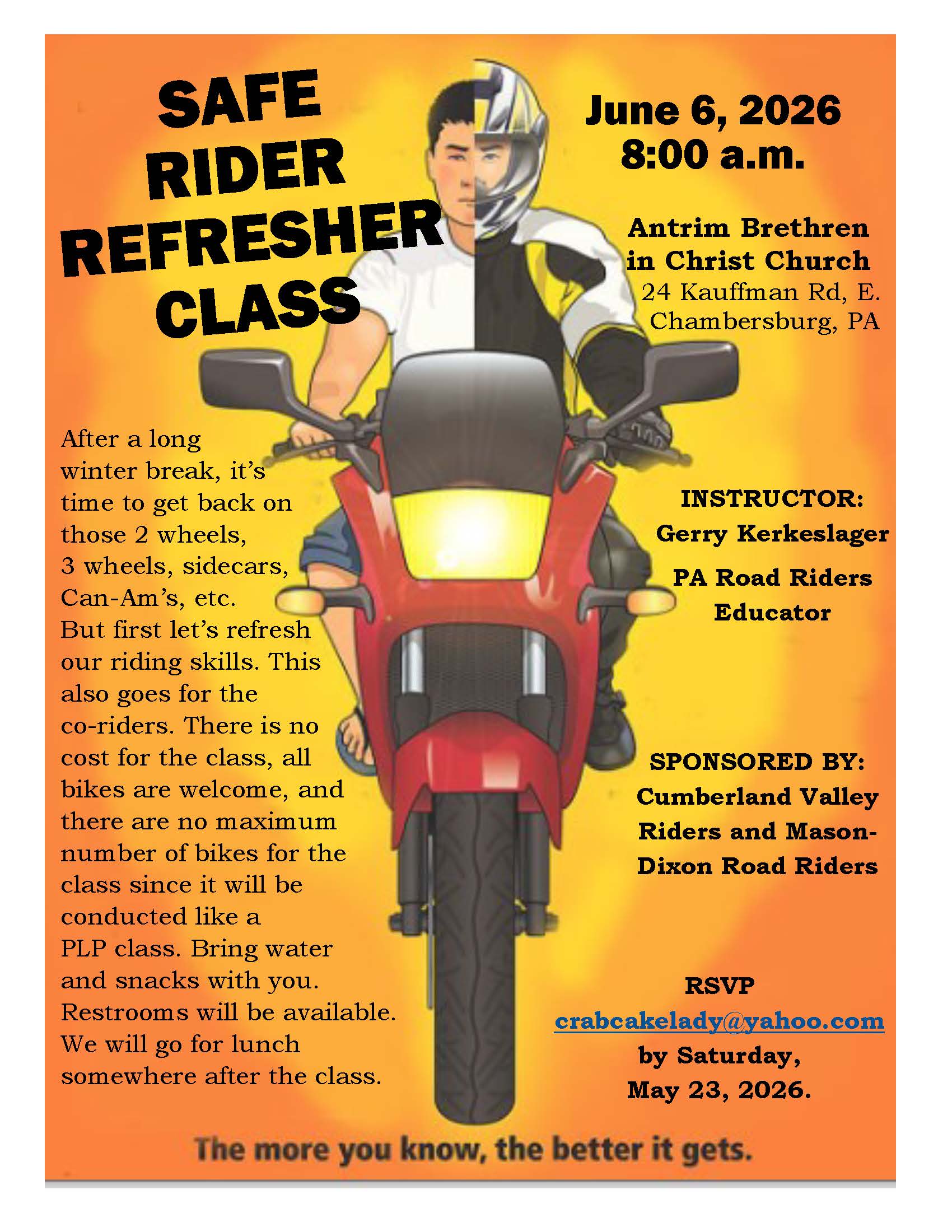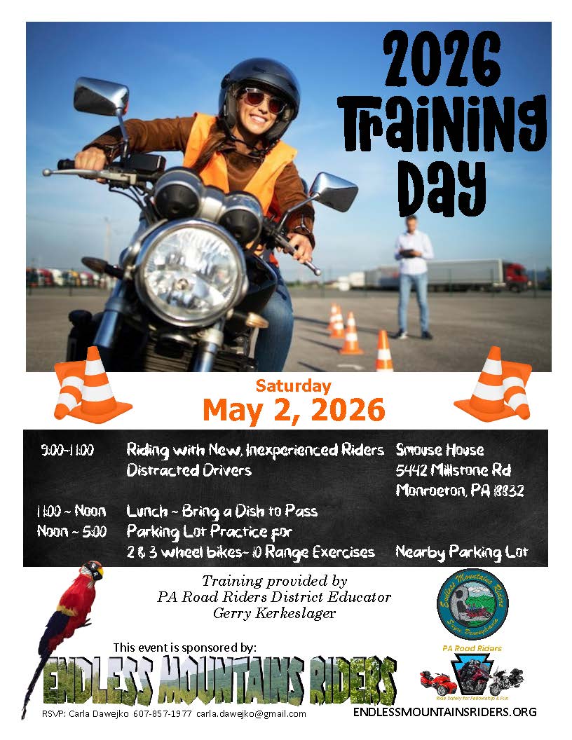 Join the Endless Mountains Riders chapter for their annual Training Day. District Educator Gerry Kerkeslager will be on hand all day to provide classes. The schedule is as follows: 9:00-11:00 Riding with New, Inexperienced Riders Distracted Drivers Smouse House 5442 Millstone Rd Monroeton, PA 18832 11:00 - Noon Lunch - Bring a Dish to Pass […]