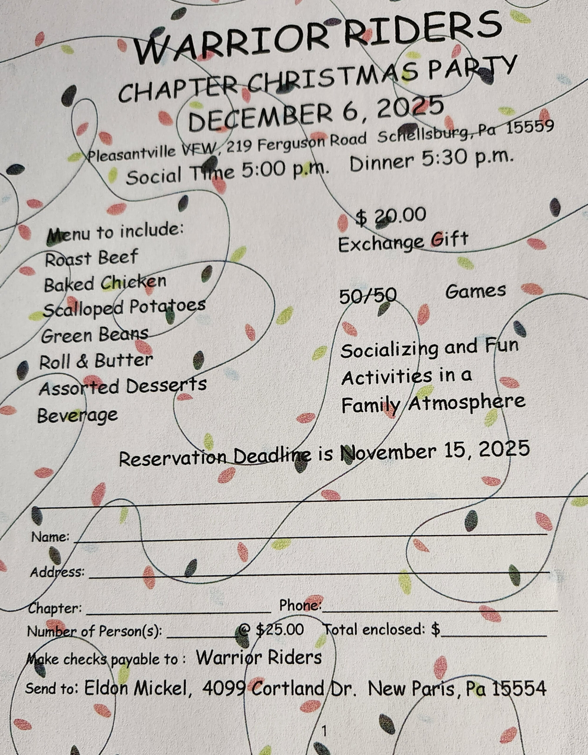 Menu includes Roast Beef, Baked Chicken, Scalloped Potatoes, Green Beans, Roll & butter, Assorted Desserts and Beverage. Bring a $20 Gift Exchange. There will be 50/50 and Games. Reservations are due November 15. $25 per person.